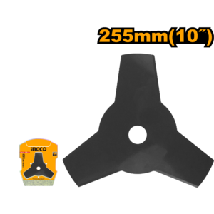 Professional 10-inch (255mm) 3-tooth brush cutter blade designed for clearing thick grass, weeds, and light brush. Compatible with GBC5434411, GBC5434421, GBC5524411, GBC5524421, and GBC5624421 gasoline grass trimmers. Packaged in a double blister