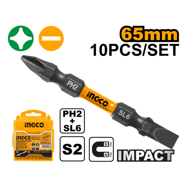 The 10 Pieces Impact Screwdriver Bit Set – SDBIM21HL133 includes 10 PH2+SL6.0*1.0 bits, each 65mm in length, designed specifically for impact drivers. Manufactured from high-quality S2 industrial steel, these bits feature a black magnetic surfac