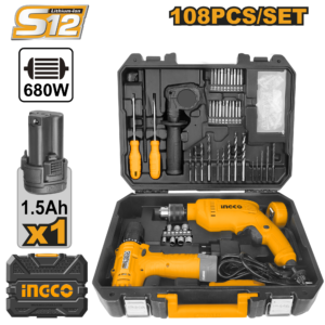 The versatile 108-piece BMC set includes 12V cordless drill (1.5Ah battery + charger), 680W impact drill (13mm chuck), SL/PH screwdrivers, 3m tape, magnetic shank, 5x twist/masonry/wood bits each, 7x CR-V power sleeves, 20x 2" bits, 30x screws