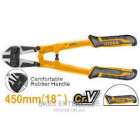 This bolt cutter features 18" Cr-V steel blades known for their strength and durability. It has a black finish and polish for corrosion resistance and comes with ergonomic TPR two-color handles for a comfortable grip. Ideal for cutting bolts,