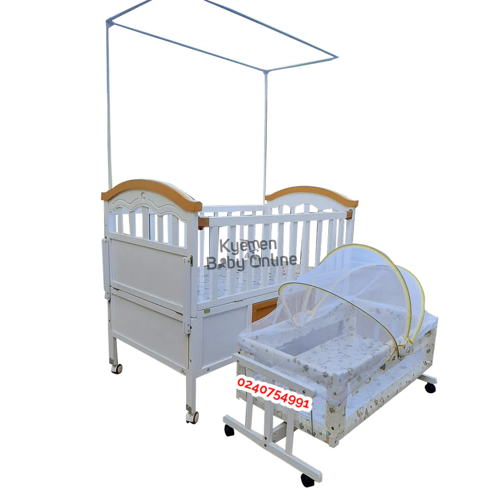 This unique cot includes two sleeping areas: a main cot that can be converted into a toddler bed, and a smaller cot that doubles as a swing—ideal for soothing your little one. Both cots come with mosquito nets, ensuring peaceful, protected sleep. A large storage drawer adds convenience for busy parents.