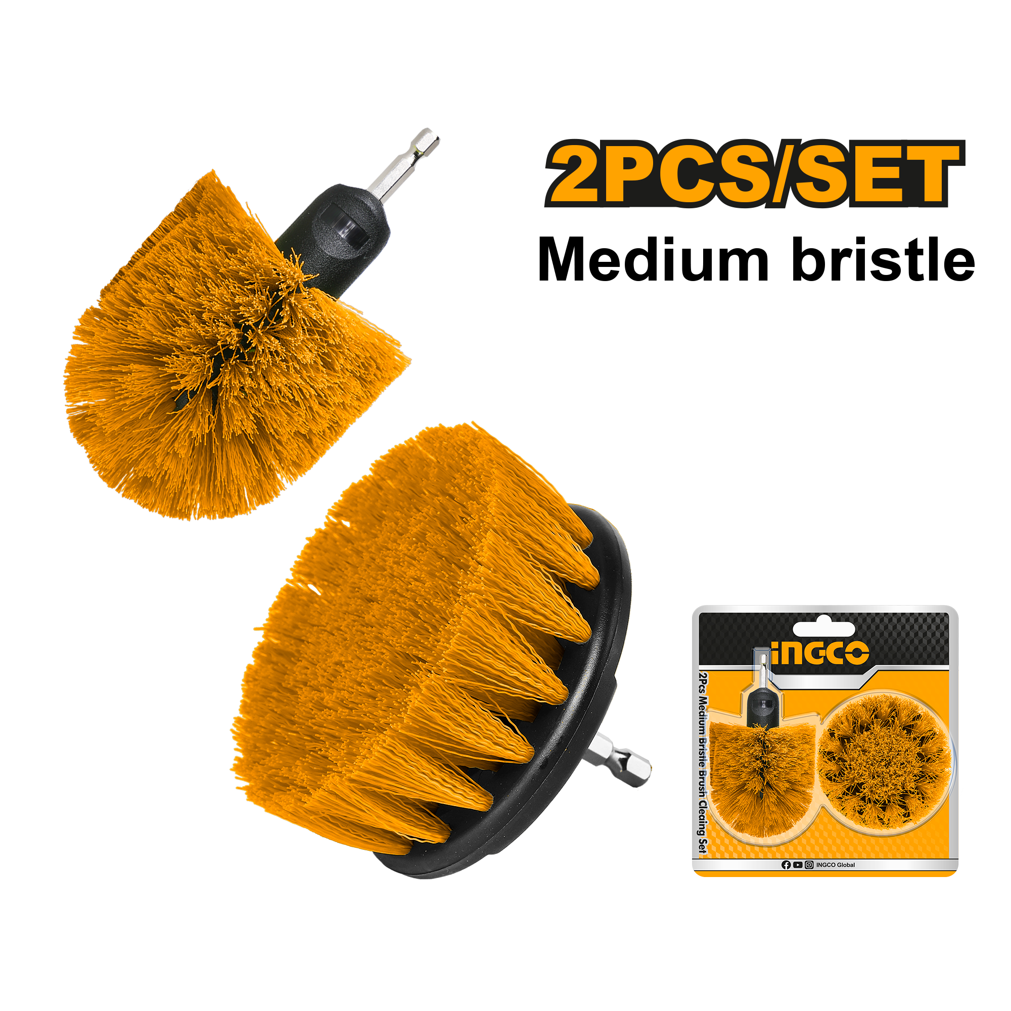 The 2 Pcs Medium Bristle Brush Set – WCBM2335 includes one 360-degree medium brush and one 3.5in medium bristle brush, both designed with a 1/4in hex shank for easy attachment to power tools. Featuring durable nylon bristles, these brushes are ideal for kitchen, bathroom, and outdoor cleaning applications, offering long-lasting performance. The set is securely packed in a double blister for safe storage and handling.