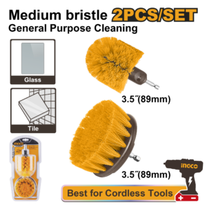 Specialized set includes a 3.5" medium brush and a 3.5" 360-degree medium brush with 1/4" hex shanks. The 360-degree design cleans surfaces from all angles, perfect for sinks, tubs, and tiles. Durable nylon bristles withstand repeated use. Packed in double blister for effective deep cleaning in kitchens and bathrooms.