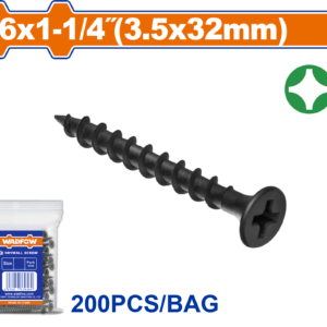 Bulk pack of 200 #6 x 1-1/4" (3.5x32mm) drywall screws with coarse thread for fast penetration into steel studs. Features a bugle head and Phillips drive for flush installation and a black phosphated finish for corrosion resistance. Packaged i