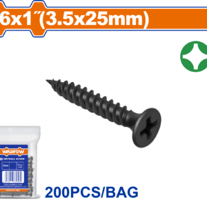 Box of 200 #6 x 1" (3.5x25mm) drywall screws with fine threads for superior holding power in wood studs and furring strips. The bugle head and Phillips drive provide a clean finish, while the black phosphate coating prevents rust. Packaged in a plastic bag for wood framing applications.