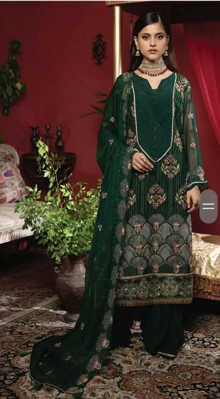A stylish 2023 collection outfit featuring an embroidered chiffon top with sleeves and a 2.5-yard chiffon dupatta. Paired with plain raw silk trousers, this set offers a modern and sophisticated look for special occasions.