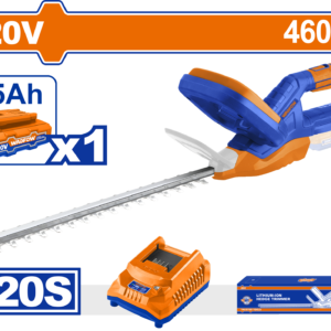 The laser-cut blade trimmer (460mm, 15mm diameter) for shaping bushes. 1.5Ah battery + charger—color box for garden maintenance, topiary, and ergonomic pruning.
