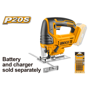 The variable-stroke bare jigsaw (2400spm) with tool-free blade change and 4-position orbital. Cuts 80mm wood/8mm steel—includes 5 blades; color box for curves, plunge cuts in cabinetry (battery/charger separate).
