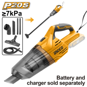 The portable L-I vac (high ≥7kPa/low ≥5kPa) with stainless HEPA-style filter, crevice, brush, floor heads, flex + 2 rigid wands. Battery/charger separate—color box for auto detailing, workshops, stairs, and spot cleanup.