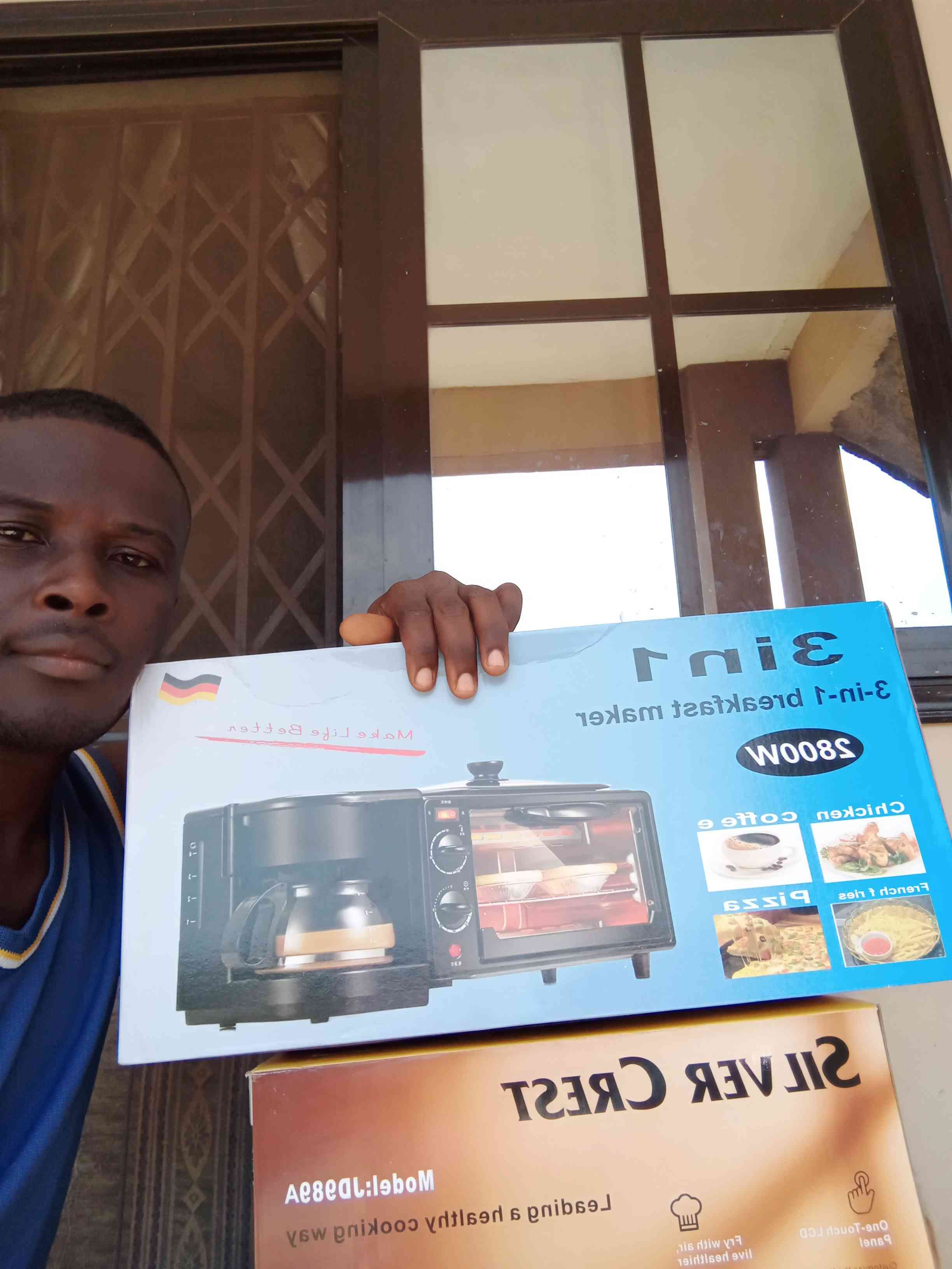 Compact multifunction: 8L oven (bake/toast), 600ml non-stick skillet, 4-cup coffee station. Independent controls, 60min timer. Crumb tray, glass door. 220V, 35x25x20cm. Includes baking tray, fry basket. Ideal dorms, small kitchens. 1-year warranty. Fast shipping in Accra.