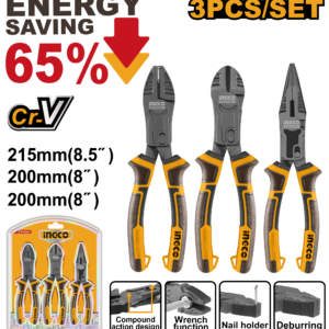 Innovative compound action pliers set includes 8" combination, 8" diagonal cutting, and 8.5" long nose pliers. The compound leverage mechanism reduces hand force required by 65%. Made from Cr-V steel with a non-stick Teflon coating and