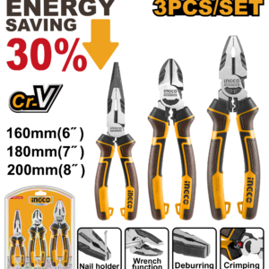 Advanced 3-piece pliers set featuring an 8" combination, 7" diagonal cutting, and 6" long nose model. The high-leverage design saves 30% effort and includes a crimping function alongside nail holding, spanner, and deburring capabilitie