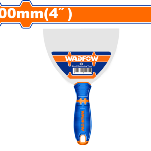 The wide flexible trowel (100mm) with polished stainless, hardened edge, and comfort grip. Versatile—label for spackling, taping, and medium-area finishing.