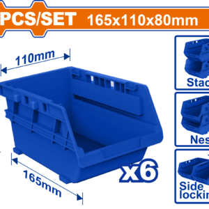 Versatile set of 6 PP plastic storage bins, each measuring 165x110x80mm. Bins can be stacked, nested, and side-locked to create custom storage walls. Features include wall-mounting capability and compatibility with hanging panels. Perfect for organizing small parts, hardware, and craft supplies. Packaged with a label.