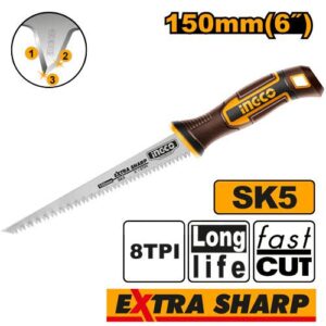 High-performance 6" (150mm) wallboard saw made from SK5 steel with heat-treated teeth. Features 8 TPI and triple-ground teeth on three edges for faster cutting and extended blade life. Packaged in a color sleeve for creating clean openings in