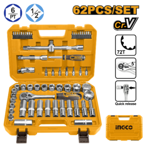 Complete socket toolkit includes 1/2” 72T quick-release ratchet, 17 regular and 10 deep sockets (10–32mm), universal joint, spinner, extension bars, spark plug sockets, bit sockets, and 20 pieces of 1/4” screwdriver bits. High quality, chrom