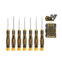 This 7-piece precision screwdriver set is designed for detailed work on electronics, small appliances, and precision instruments. It includes flathead (SL2.0, SL2.5, SL3.0), Phillips (PH00, PH0), and Torx (T6, T8) screwdrivers, all with 50mm blade lengths. Made from durable Cr-V steel, each tool features an ergonomic, comfort-grip handle for better control. The set comes in a compact, newly designed plastic box for convenient storage.