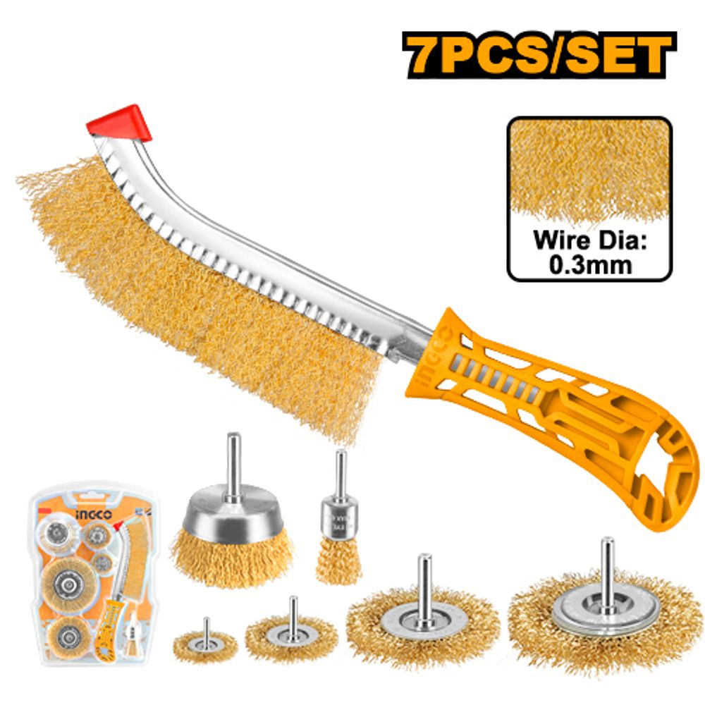 The 7-Piece Wire Cup & Wire Wheel Brush Set – WB10071 includes a comprehensive assortment of wire brushes for various surface preparation tasks. The set contains one 10in wire brush, one 1in wire end brush with shank, one 1.5in circular grinding