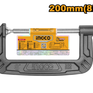 Heavy-duty 8" (200mm) G-clamp made from malleable cast iron, designed for the toughest clamping jobs where maximum strength is required. The T-shaped thread facilitates quick setup. Packaged on a paper card, it's suited for industrial fabr