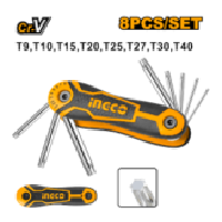 This 8-piece pocket Torx key set includes sizes T9 through T40, crafted from durable chrome vanadium steel (Cr-V). Each key undergoes heat treatment and is finished with a chrome plating for enhanced strength and corrosion resistance. The compact