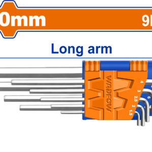 Durable 9-piece long arm hex key set (1.5mm to 10mm) crafted from heat-treated Chrome Vanadium (Cr-V) steel. The long arm design provides increased leverage for tackling tight or stubborn fasteners. Features a chrome finish and is packaged on a sliding card.