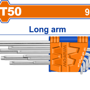 Durable 9-piece Torx key set (T10 to T50) crafted from Chrome Vanadium (Cr-V) steel. The long arm design provides increased leverage for tackling tight fasteners. Heat-treated and chrome-plated for longevity. Packaged on a sliding card.