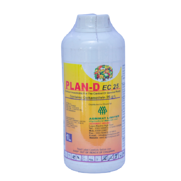 Plan-D EC 25 acts by contact and ingestion. Dilute the appropriate quantity of Plan D with water and spray thoroughly the plants to be protected with any type of suitable sprayer. It controls caterpillars, cutworm, grasshoppers, Aphids, Thrips, Wood borers, Mosquitoes Ants, etc.