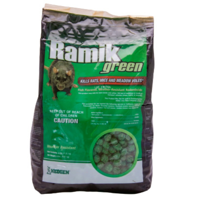 Ramik Green Bait is a fish flavored , weather-resistant rodenticide which kills rats, mice and meadow voles. This product may only be used inside and within 100 feet of buildings or inside of transport vehicles( ships, trains, or aircraft). This p
