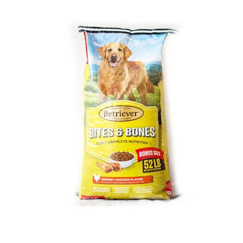 Bites and Bones Dog Food 52 lb is a 100% complete and balanced formula crafted to meet the daily nutritional needs of adult dogs. Enriched with omega-6 fatty acids, this premium dog food supports a healthy skin and a shiny coat, while added fiber