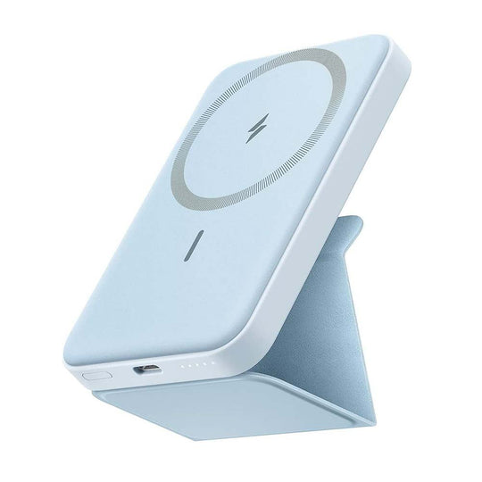 A magnetic 5000mAh power bank that wirelessly charges iPhone 12/13+ and doubles as a viewing stand. Features a foldable kickstand, strong magnets, and a slim, portable design.