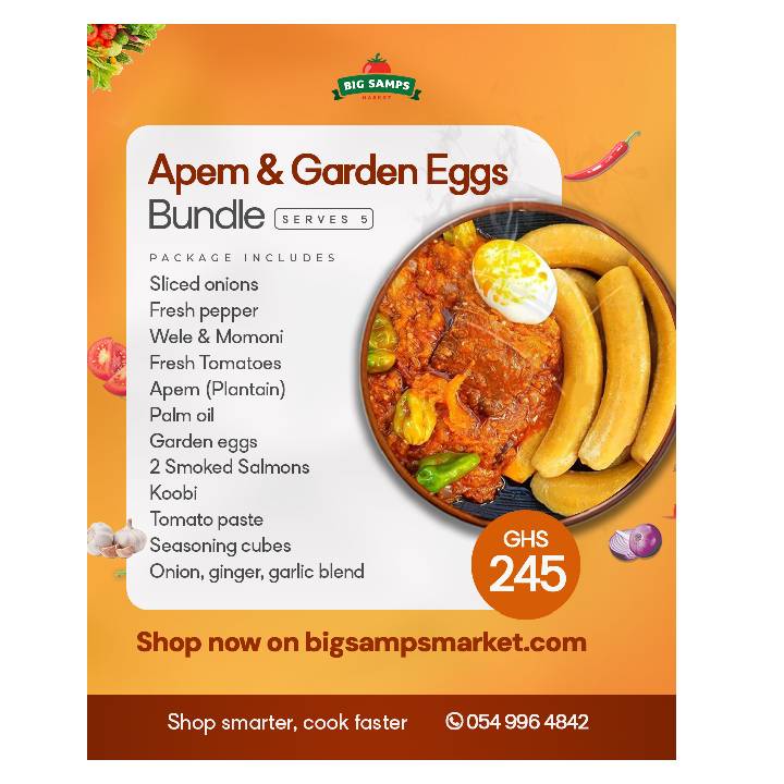 Enjoy the traditional taste of Ghanaian cuisine with the Apem and Garden Eggs Bundle, specially curated for convenience and flavor. This 5-serving package includes Apem plantains, fresh tomatoes, fresh pepper, tomato paste, garden eggs, sliced onions, smoked salmon (2 pieces), seasoning cubes, a flavorful blend of onion, ginger, and garlic, palm oil, and koobi (1 piece). Perfect for preparing a hearty and authentic local meal with minimal effort.
