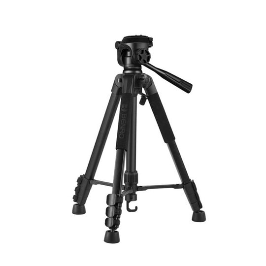 A robust yet portable aluminum tripod supporting up to 9.9 lbs. Features a geared center column, flip leg locks, and a quick-release video head with an adjustable pan bar, ideal for photographers and videographers on the move.