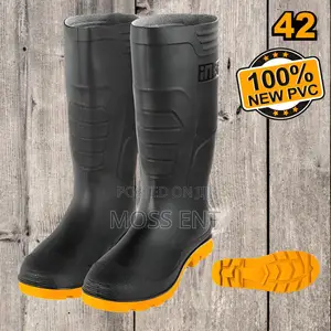 "Size:42 Material:100% Virgin PVC Height:37cm High level oil, acid, alkali resistance 100%. This professional steel-toe safety boot and puncture-resistant work shoe provides comprehensive foot protection against crushing, puncture, electrical hazard, and slip injuries in construction, mining, manufacturing, warehousing, and industrial work environments. The hardened steel or composite toe cap withstands impacts up to 200 joules and compression loads up to 15kN — meeting EN ISO 20345 S3 or ASTM F2413 safety footwear standards. The Kevlar mid-sole insert provides flexible, lightweight puncture resistance against nails and sharp objects on construction sites and in waste management applications. The water-resistant genuine leather or microfibre upper with breathable lining keeps feet dry and comfortable during extended working shifts. Anti-static sole dissipates electrostatic charge in electronics manufacturing and explosive environments. Available in sizes 40–46. Brands include Vaultex, Secor, Blundstone, and Ingco.