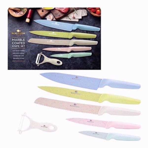 A perfect blend of style and function, the Blackmoor Home 6-Piece Knife Set includes three 8-inch knives, a utility knife, a paring knife, and a metallic peeler. The non-stick marble-coated blades prevent food sticking, while the ergonomic handles