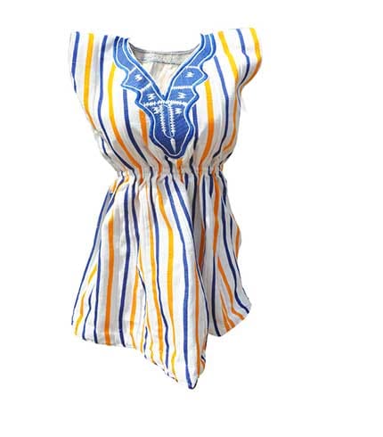 100% handmade ladies smock (Fugu) featuring bright colors and beautiful embroidery. From traditional weaving to final garment completion, this multicolored top represents authentic African craftsmanship guided by expert traditional weavers and smo