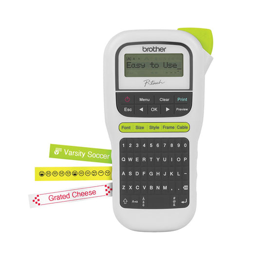 The Brother PT-H110 creates durable, laminated TZe labels up to 12mm with 3 fonts, 14 frames, 250+ symbols, and cable mode. QWERTY keyboard, preview display, stores 15 labels—battery (6xAAA) or AC powered. Includes 12mm black-on-white tape—lig