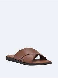 Indulge in luxury with Calvin Klein's brown leather criss-cross slippers. Featuring a leather upper, a soft leather inner, and a durable leather sole, these slip-ons offer a perfect blend of sophisticated design and everyday comfort for relaxe