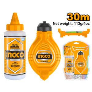 Heavy-duty 30m chalk line reel features a robust, rubber-covered body for added grip and durability. Includes one bottle of chalk, a spirit bubble for level checking, and a 4oz blue powder bottle. Packed by double blister, this model is ideal for intensive use in marking and alignment in demanding jobsite environments.
