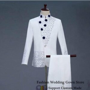 This stylish White Chinese Tunic Suit set for men offers an "England Style" with a skinny fit. Made from 100% polyester, it features a flat front, short length, and zipper fly. The elegant embroidery and solid pattern make it suitable for