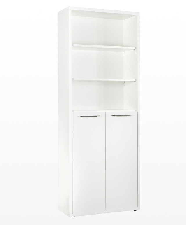 Constructed from durable particle boards in a modern walnut and grey color palette, with a clean white color family finish, this storage cabinet features 3 shelves and 2 doors for secure and organized storage of documents, supplies, or household items.