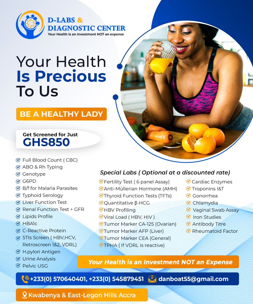 The Full Screening for Ladies offers a comprehensive health assessment covering various essential aspects. It includes tests for blood-related conditions such as CBC, blood typing, genotype, and G6PD deficiency. Additionally, it screens for infect