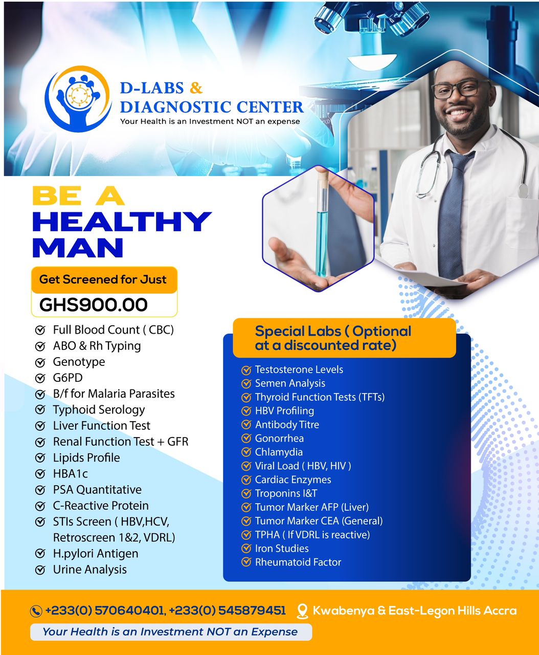 D-Labs and Diagnostic Center: Your Health is an investment Not an expense Overview: Welcome to D-Labs and Diagnostic Center, where we offer a wide spectrum of laboratory services tailored to meet your healthcare needs. Our commitment to convenient healthcare extends to our mobile sample collection services, ensuring that quality diagnostics are accessible wherever you are. We also train and coach young and upcoming scientists to achieve the goal of improving on quality and efficient diagnostic services in healthcare to minimize the mortality rate resulting from delay of diagnosis and hence treatment.
