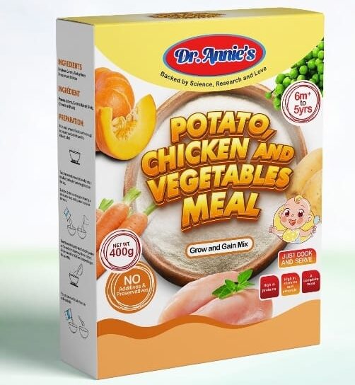 Nourish your growing baby with Dr. Annie's Potato, Chicken and Vegetables Meal - a wholesome blend of premium chicken, nutritious potatoes, and garden vegetables. This complete meal provides balanced nutrition to support your baby's development during weaning, with all the goodness of homemade food in convenient powder form.