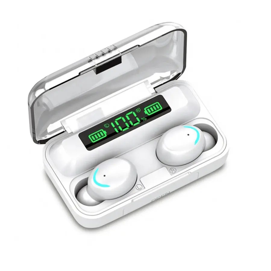 F9-5 wireless earbuds featuring waterproof IPX5 ratings, hybrid noise cancelling microphone, Bluetooth v5.0+EDR, apt-X codec support. Includes digital battery display, game atmosphere light, and volume control. Offers 4-hour play/call time with 1.