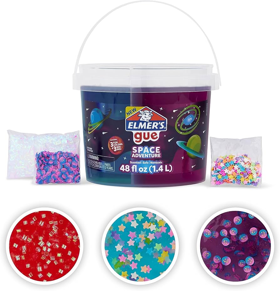 Blast off into a world of interstellar creativity with Elmer’s Gue Space Adventure! This galactic-sized 3-pound bucket features three premade slimes, each with its own unique color and fragrance, plus three sets of exciting mix-ins. Perfect for