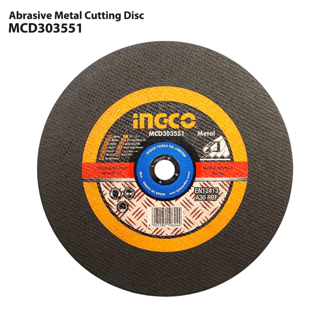 The Ingco 14" Abrasive Metal Cutting Disc MCD303551 measures 355mm (14") in diameter with a 3.0mm (1/8") thickness and a 25.4mm (1") arbor. Featuring a flat centre design, it is perfect for cutting metal and Inox (stainless steel).
