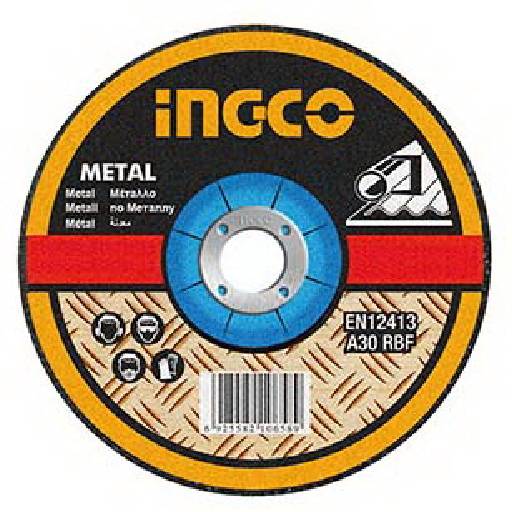 The Ingco Abrasive Metal Cutting Disc MCD301151 is a 115mm (4-1/2") cutting disc with a 3.0mm thickness (1/8") and a 22.2mm arbor (7/8"). It features a depressed centre design and is suitable for cutting metal and Inox (stainless steel