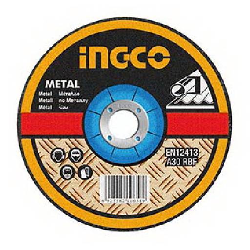 The Ingco Abrasive Metal Cutting Disc MCD301251 is a 125mm (5") cutting disc with a 3.0mm thickness (1/8") and a 22.2mm arbor (7/8"). It features a depressed centre design and is suitable for cutting metal and Inox (stainless steel). P