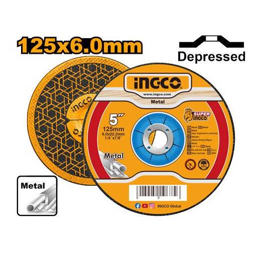 The Ingco Abrasive Metal Grinding Disc MGD601251 is a 125mm (5") grinding disc with a 6.0mm thickness (1/4") and a 22.2mm arbor (7/8"). It features a depressed centre design, perfect for metal grinding tasks. Packed by label for secure handling and easy storage.