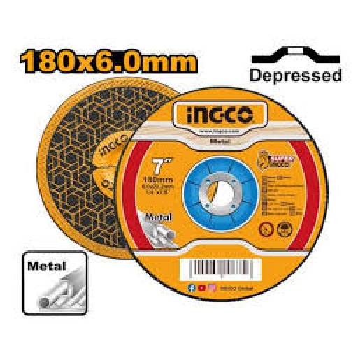 The Ingco Abrasive Metal Grinding Disc MGD601801 is a 180mm (7") grinding disc with a 6.0mm thickness (1/4") and a 22.2mm arbor (7/8"). Featuring a depressed centre design, it is ideal for grinding metal surfaces. Packed by label for s